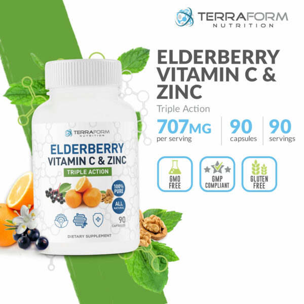 Natural Elderberry Capsules with Zinc & Vitamin C – Triple Immune Support 600mg – 3 Month Supply
